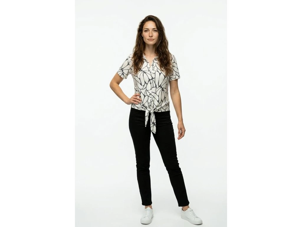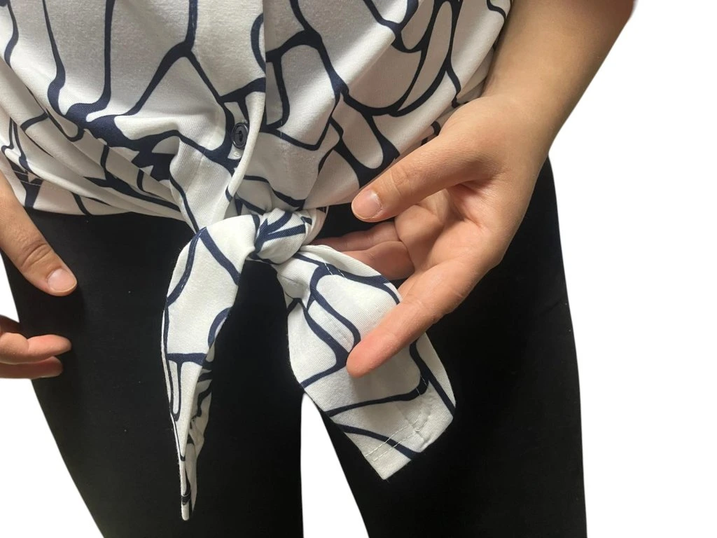 Košile od firmy Pratto s krátkým rukávem. Látka je bílá s modrým vzorem. Košile má spodní lem doplněn uzlem.