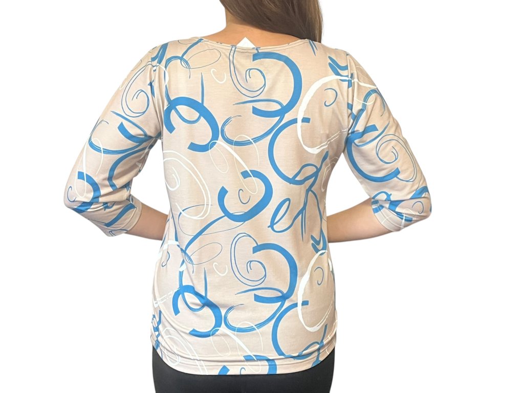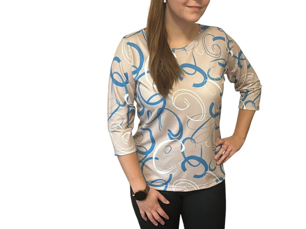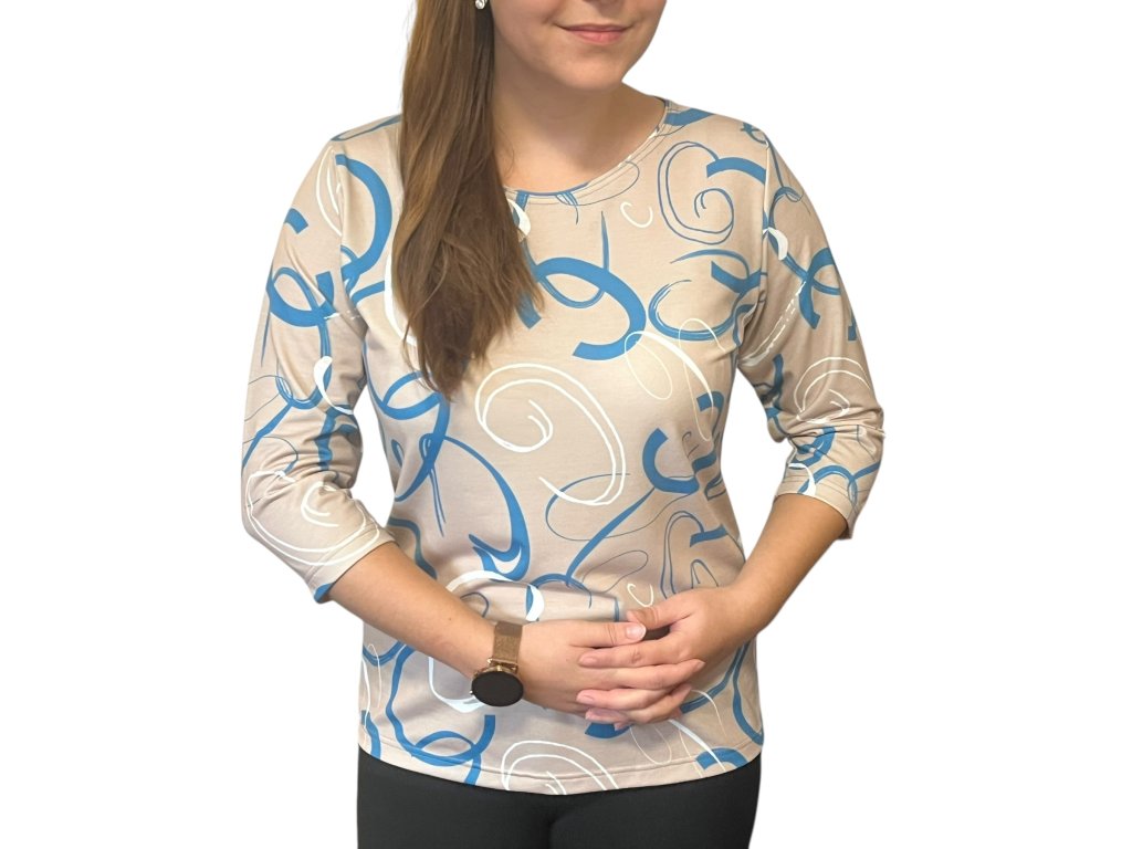 Halenka od firmy Pratto s 3/4 rukávem. Látka je béžová s modro-bílými vzory.