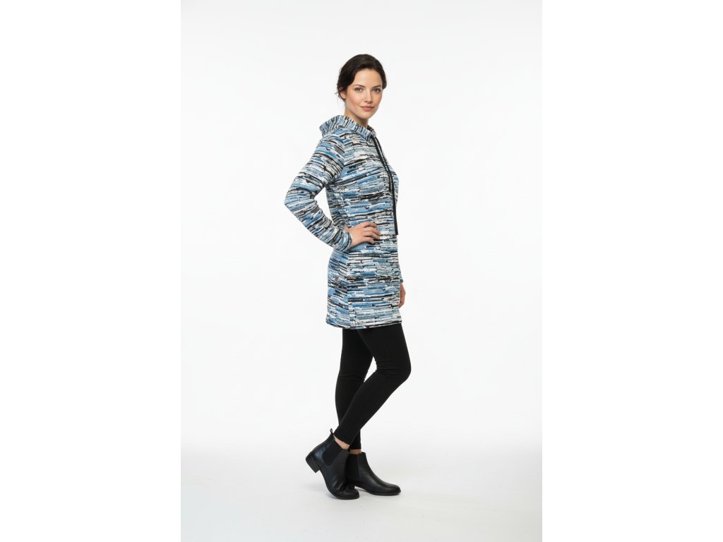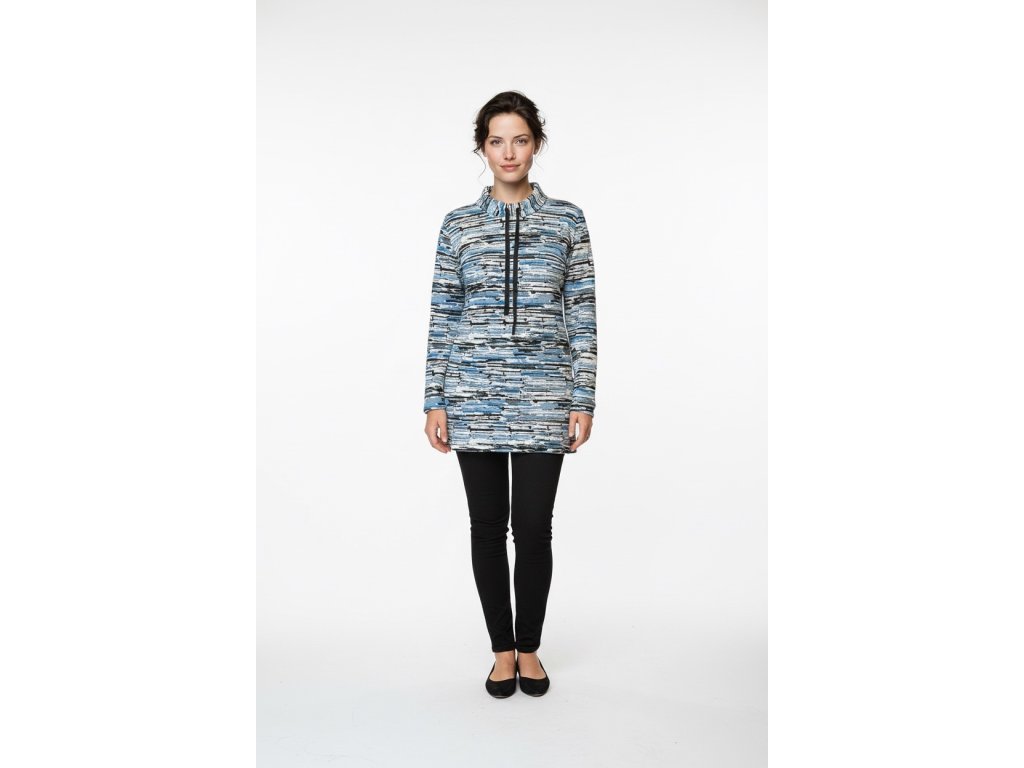 Delší svetr (tunika) od firmy Kepa style s dlouhým rukávem. Látka je šedo-modrá. Dekolt je řešen do šňůrky na stažení.