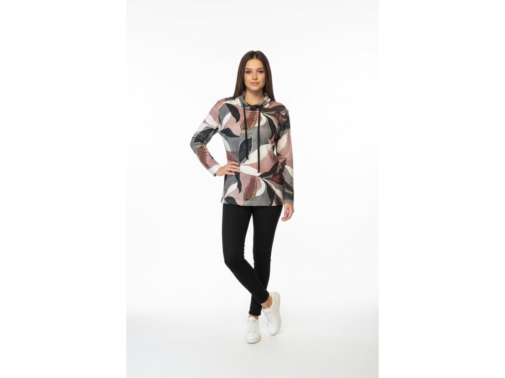 Delší halenka-svetr od firmy Kepa style s dlouhým rukávem. Látka je šedo-růžová. Dekolt je řešen do šňůrky na stažení.