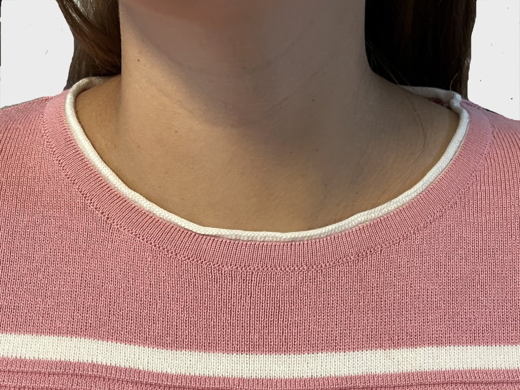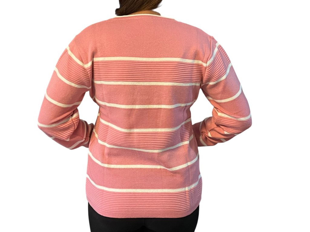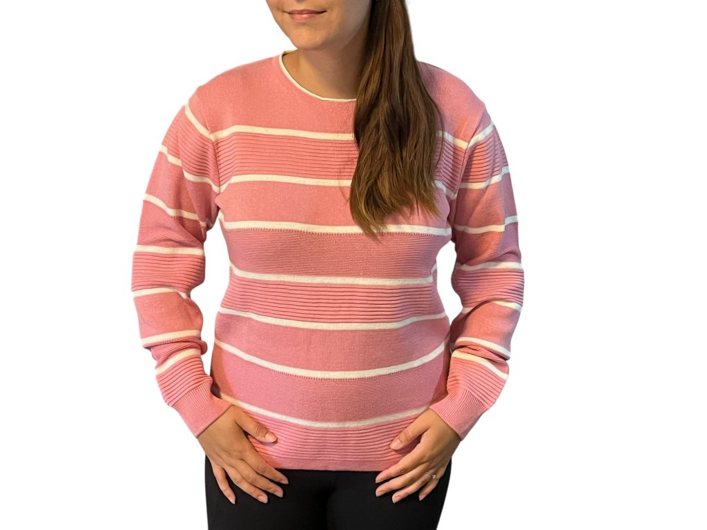 Svetr od firmy Ria móda s dlouhými rukávy. Úžasný materiál bavlna a akryl v růžové barvě s kombinací bílých proužků.