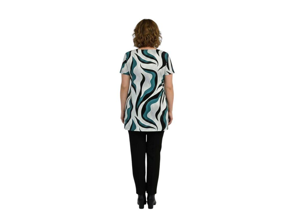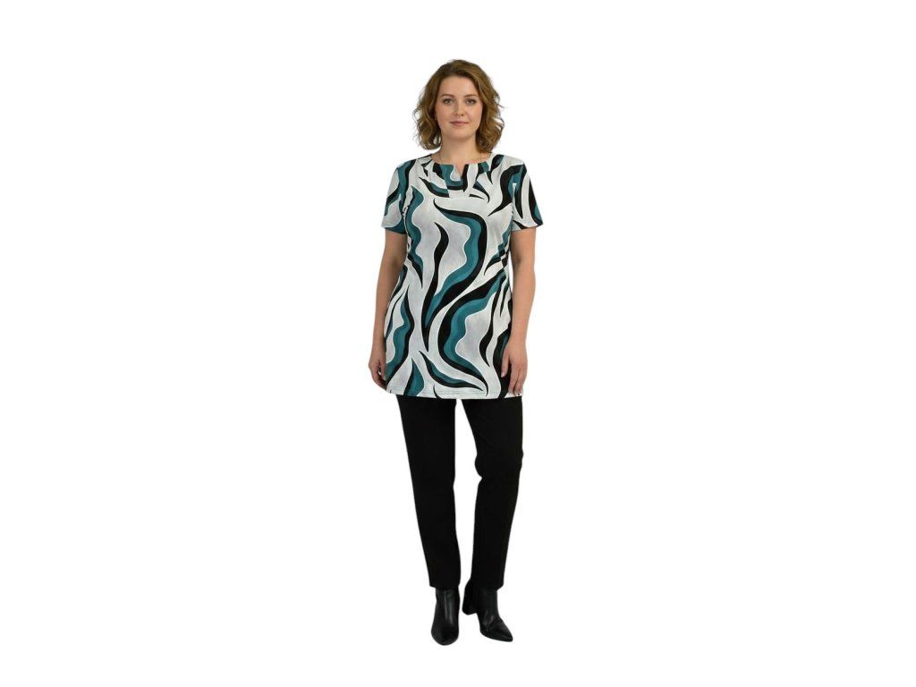Delší halenka (tunika) od firmy Kepa style s krátkým rukávem a kapsami. Látka je zelená s černým vzorem. Dekolt je doplněn malým véčkem.