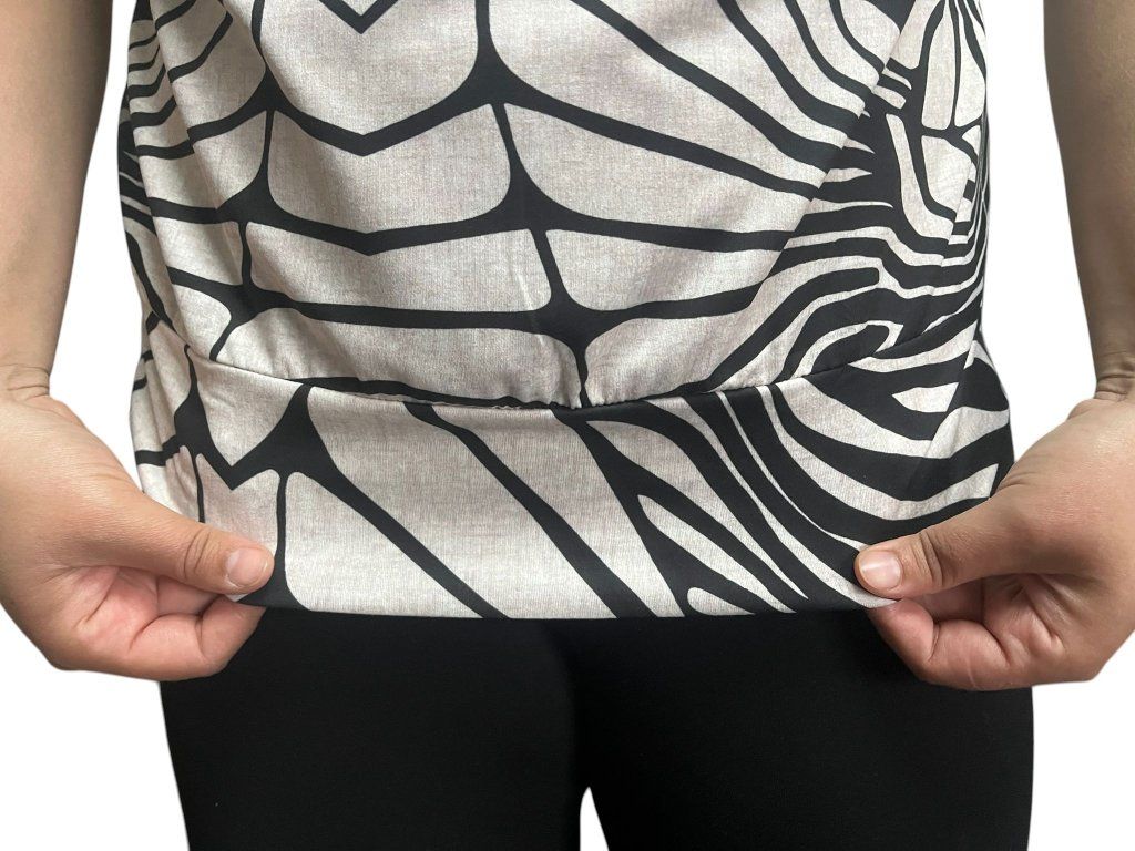 Halenka od firmy Kepa style s krátkým rukávem. Látka je béžová s černým vzorem. Halenka má spodní, širší lem, díky kterému se budete cítit dokonale.