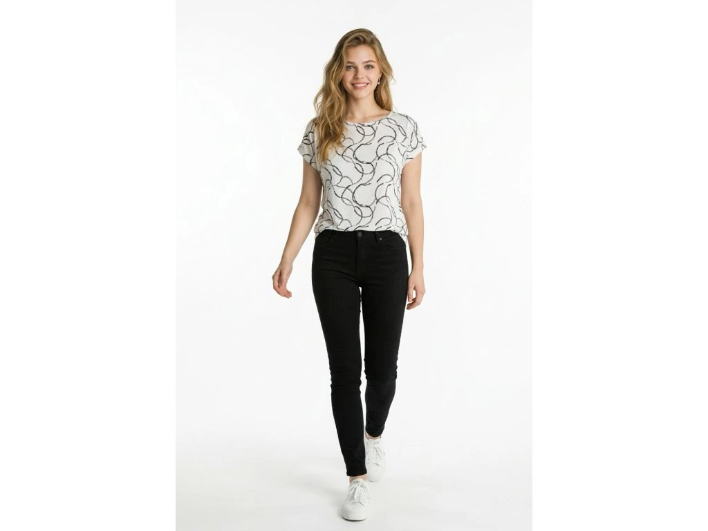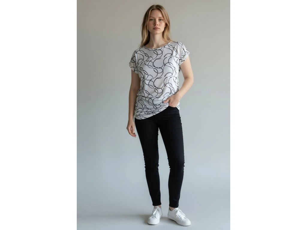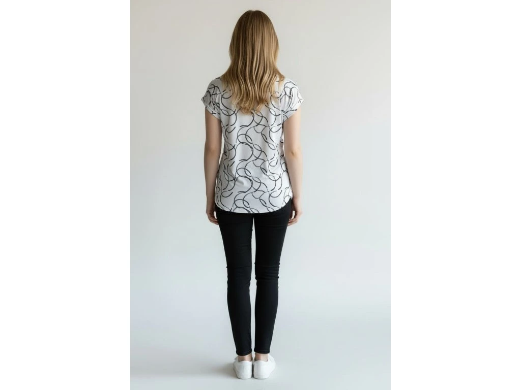 Letní halenka od firmy Pratto se spadeným rukávem. Látka je sv. šedá s černým vzorem. Halenka má gumičky na bocích, díky kterým lze upravovat délku halenky.