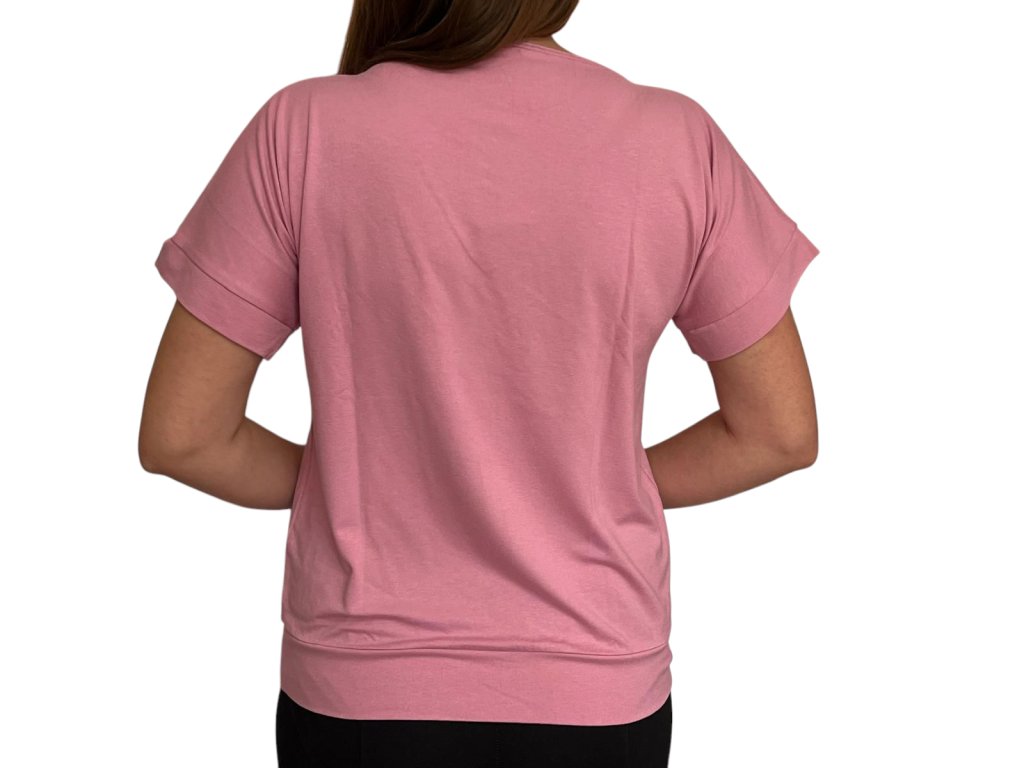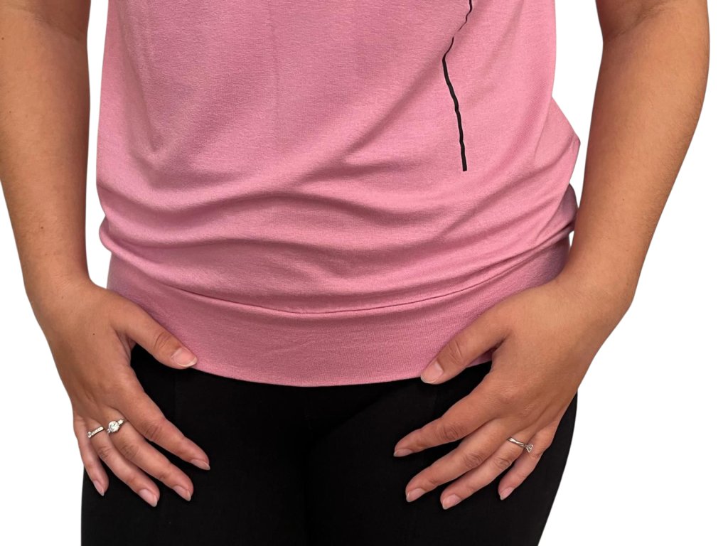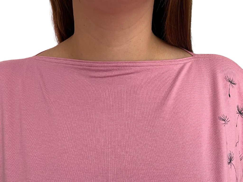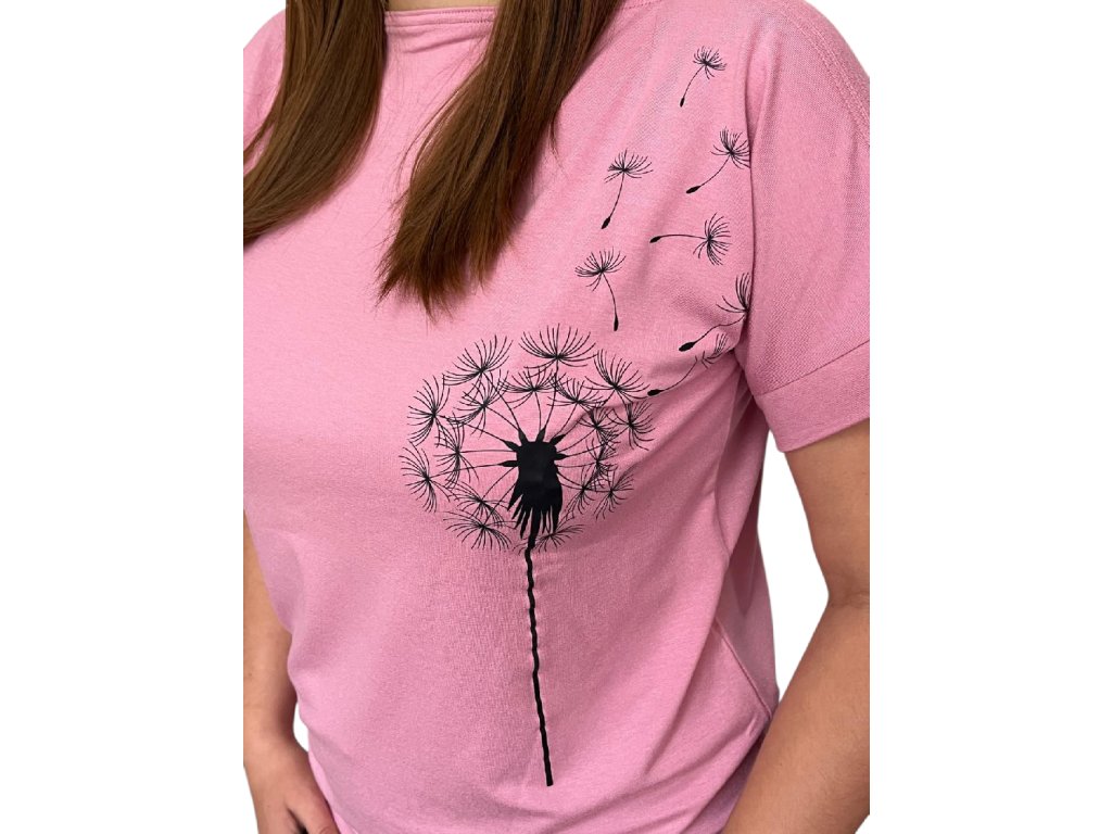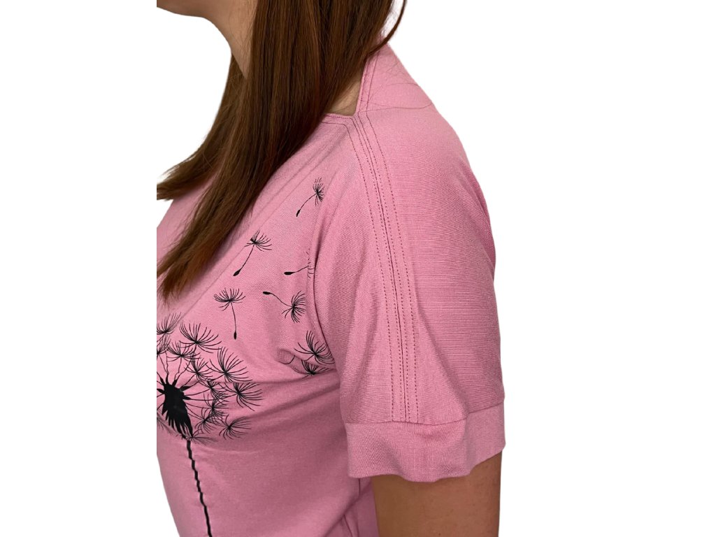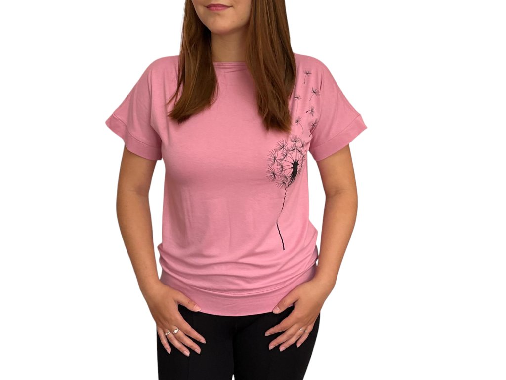Nový střih od firmy Sabatti s krátkým- spadlým rukávem. Látka je růžová doplněná černou pampeliškou. Halenka má rukávy a spodní část do širokého lemu. Dekolt je ke krku viz foto.
