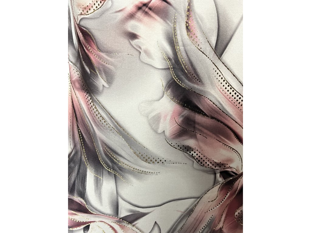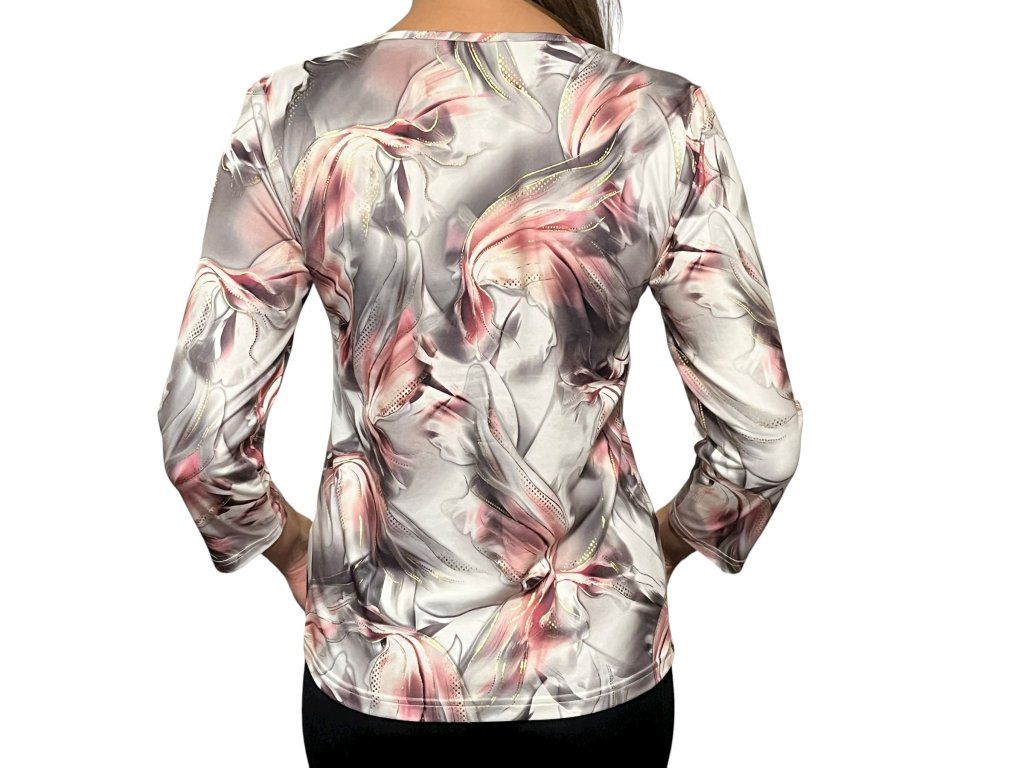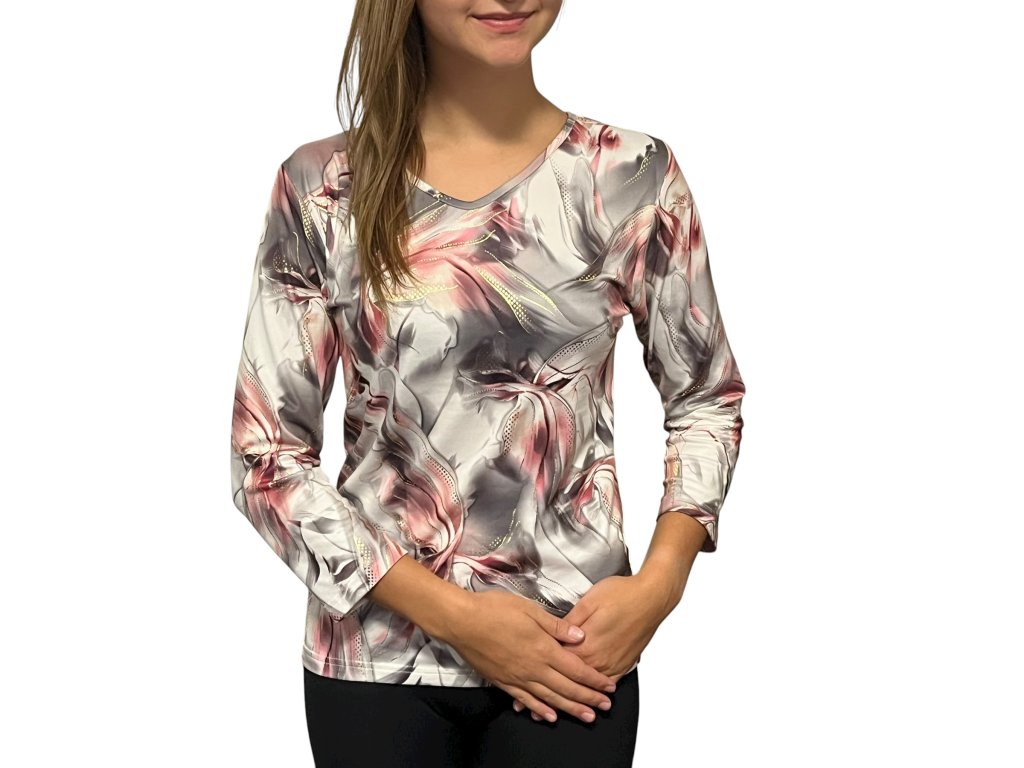 Halenka od firmy UOMO & DONNA s 7/8 rukávem. Látka je bílo-růžová se zlatými vzory. Halenka má dekolt do V.