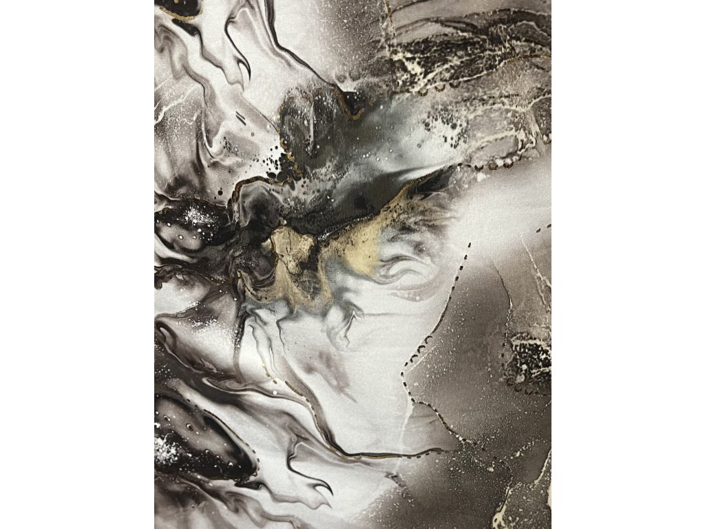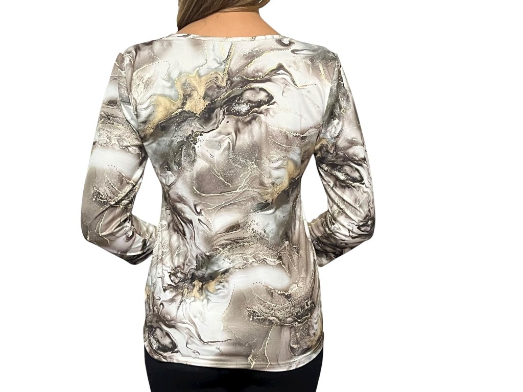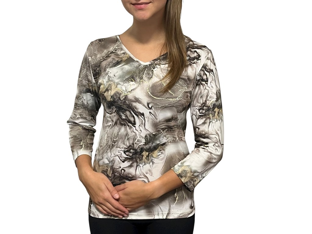 Halenka od firmy UOMO & DONNA s 7/8 rukávem. Látka je bílo-šedá se zlatými vzory. Halenka má dekolt do V.