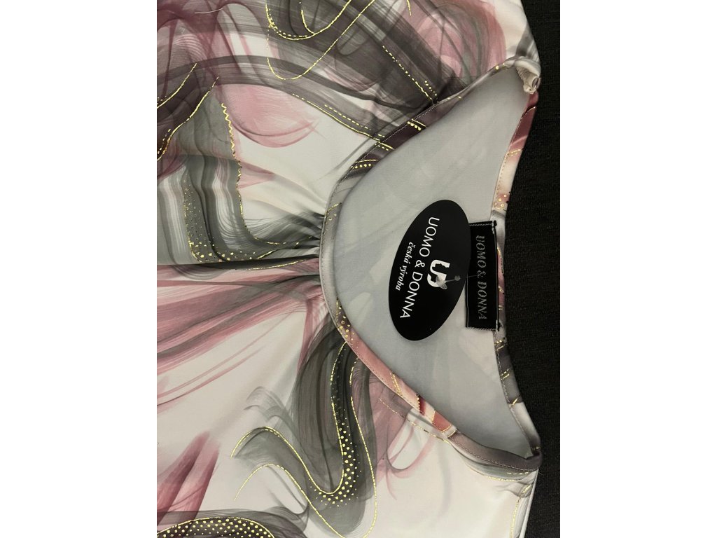 Elegantní halenka od firmy UOMO & DONNA s 3/4 rukávem. Látka je růžovo-šedá. Halenka má lehce nařasený dekolt a spodní část do lemu pro větší pohodlí.