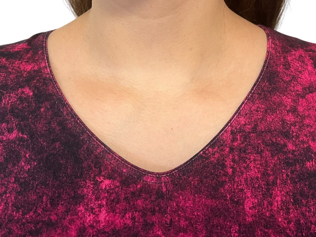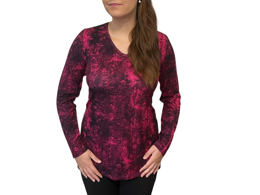 Delší halenka (tunika) od firmy Sabatti s dlouhým rukávem. Látka je černo-růžová. Dekolt je do V. Velikostní tabulka viz. níže.