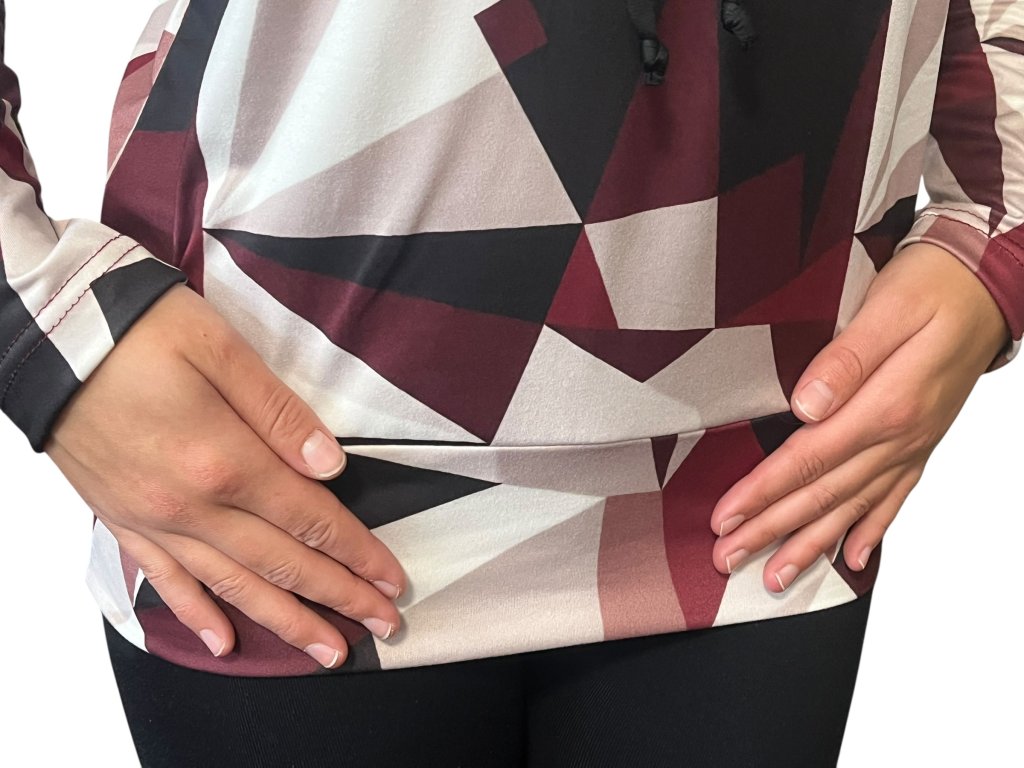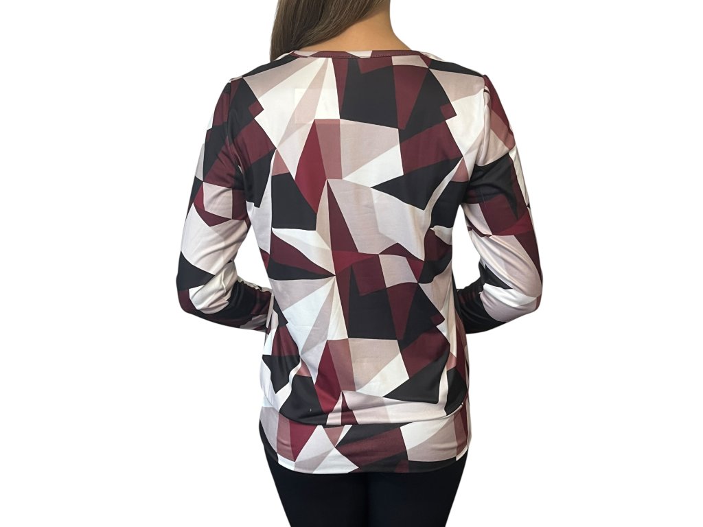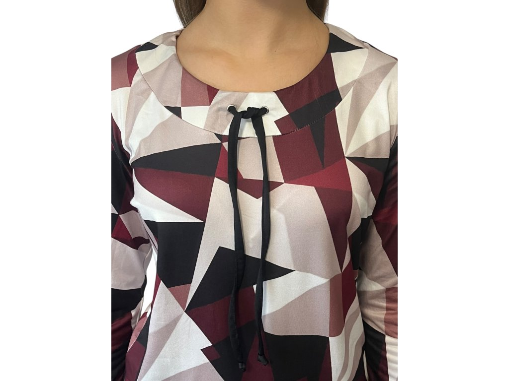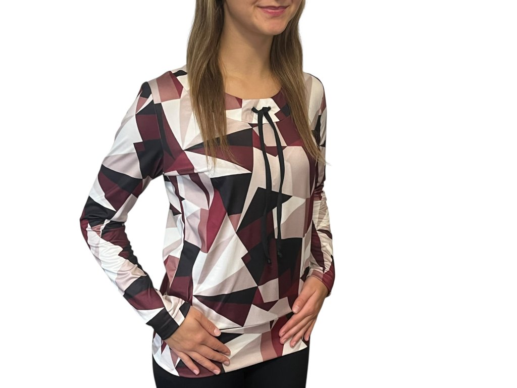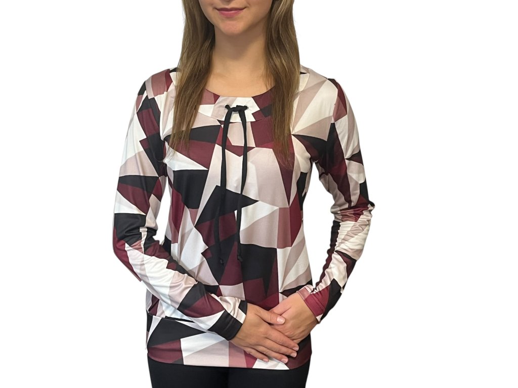 Halenka od firmy Kepa style s dlouhým rukávem. Látka je béžová s vínovým vzorem. Halenka má široký spodní lem a dekolt na šňůrku, kterou lze stáhnout dle potřeby.