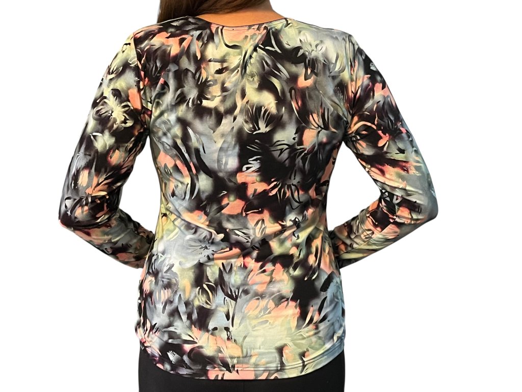 Halenka od firmy Sabatti s dlouhým rukávem. Látka je černá doplněná oranžovými květy.