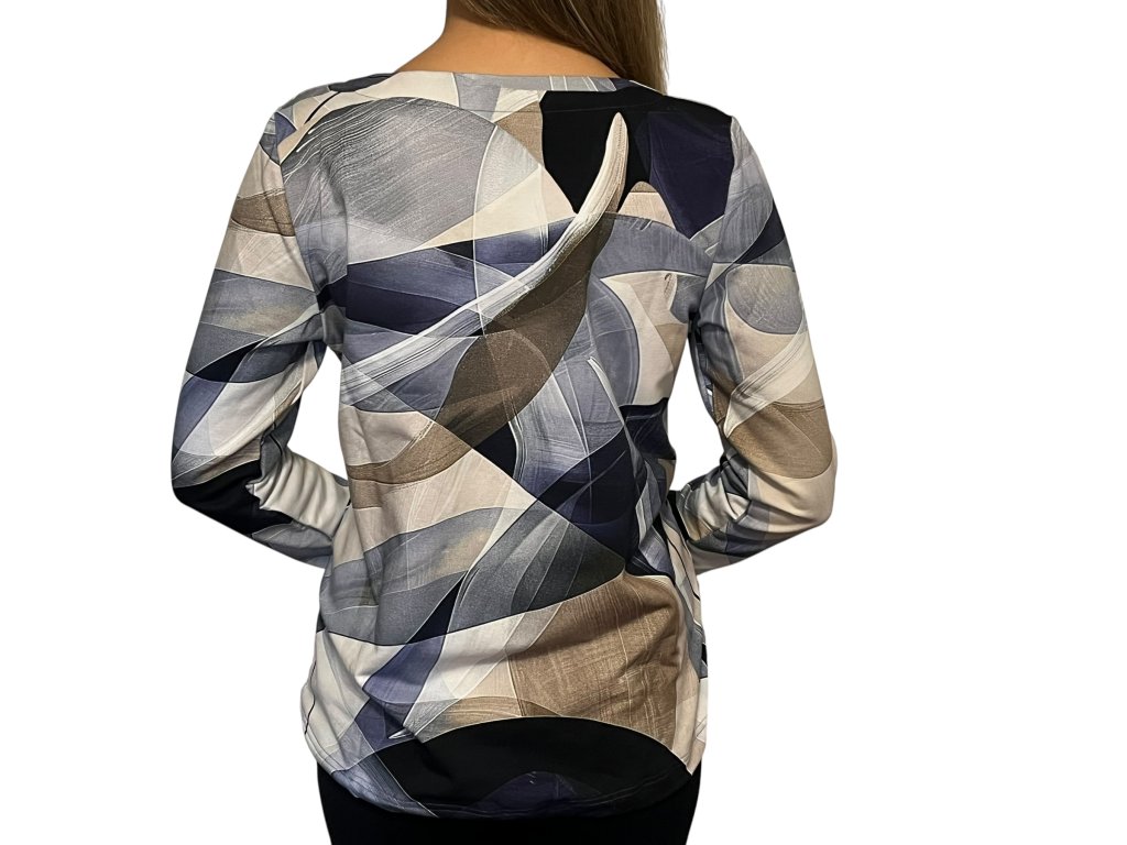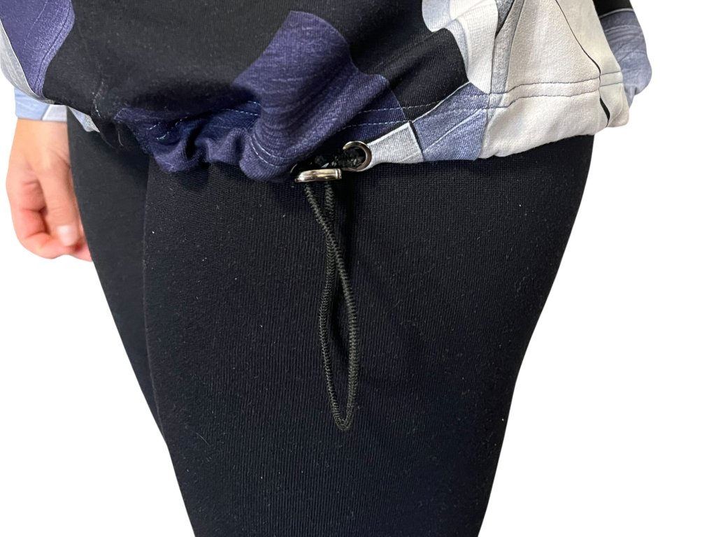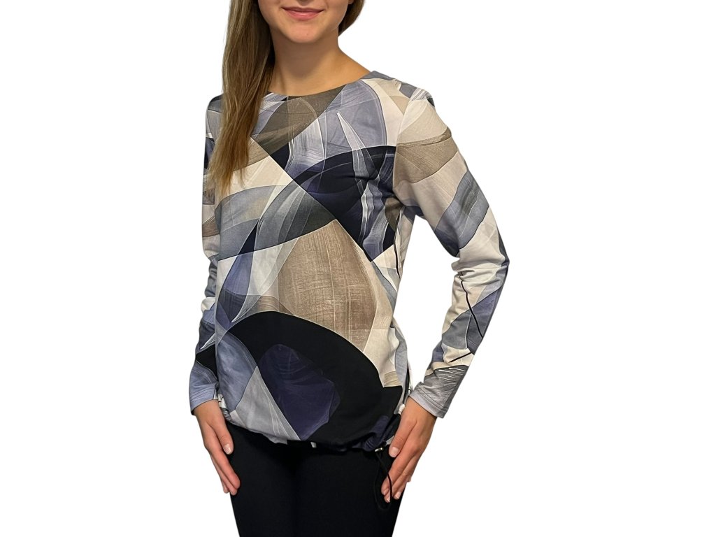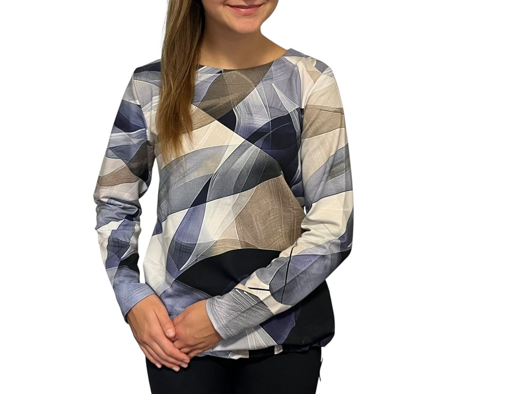 Teplejší halenka (mikina) od firmy Sabatti s dlouhým rukávem. Látka je modrá s šedým odstínem. Halenka má spodní lem do gumičky, který lze stáhnout dle potřeby.