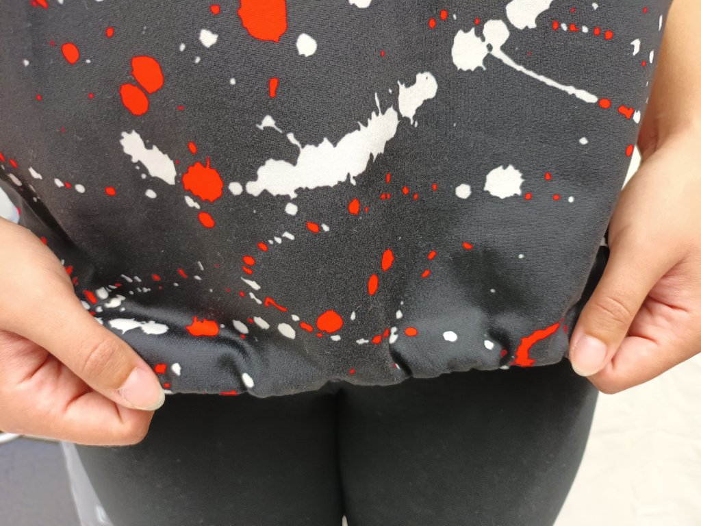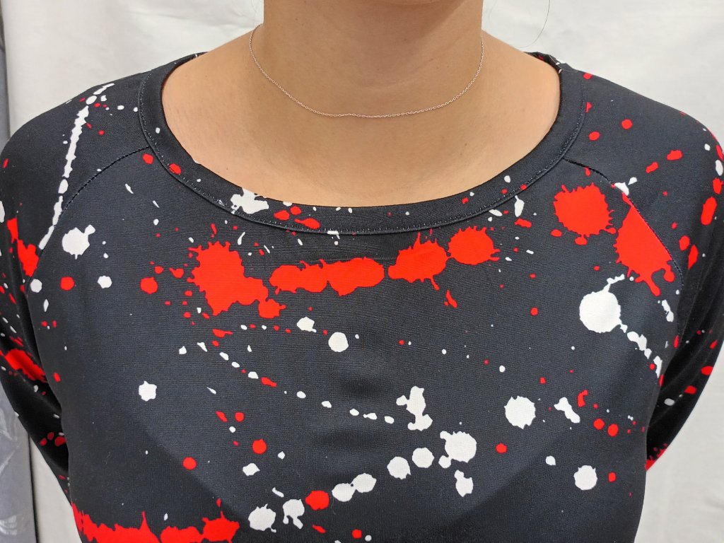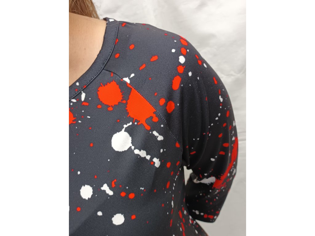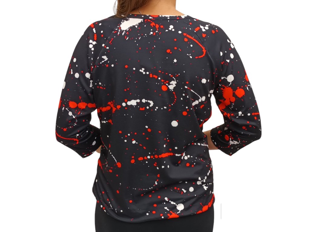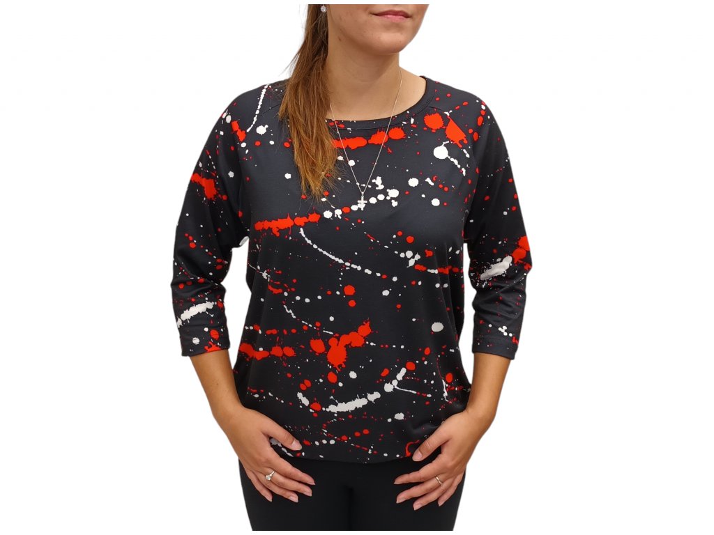Halenka od firmy Kepa style s 3/4 rukávem. Látka je černá doplněná bílými a červenými flíčky. Halenka má spodní lem do gumičky.