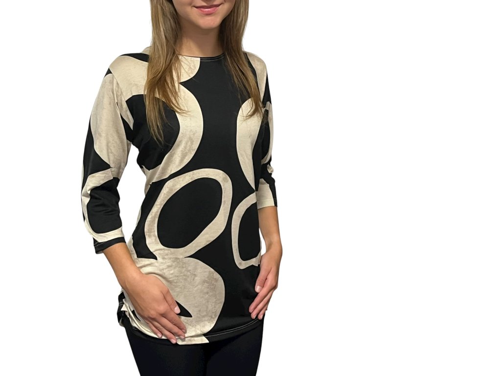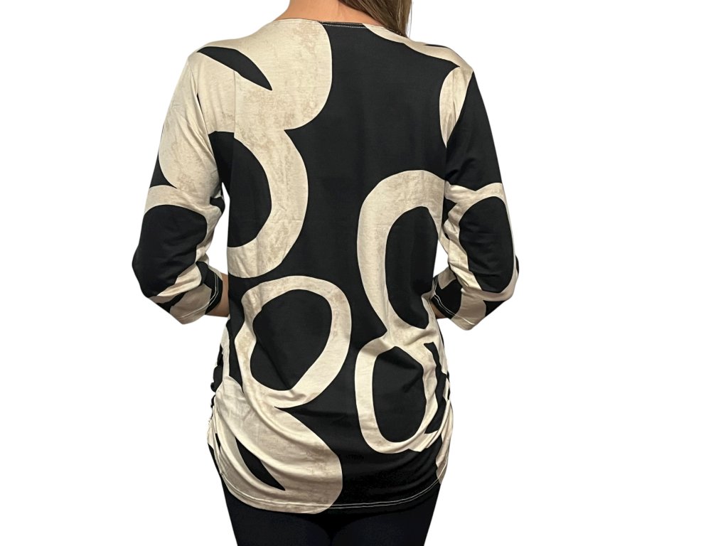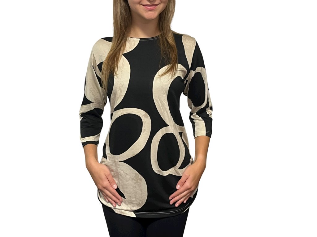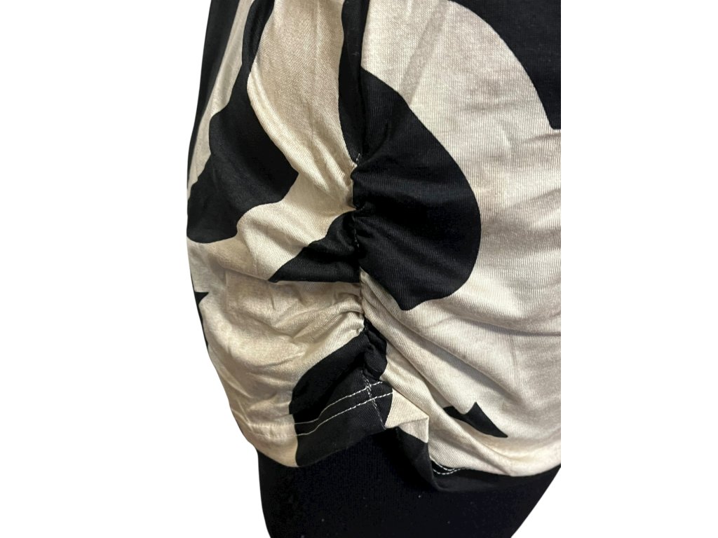 Halenka od firmy Pratto s 3/4 rukávem. Látka je béžová s černým vzorem. Halenka má na bocích gumičky.