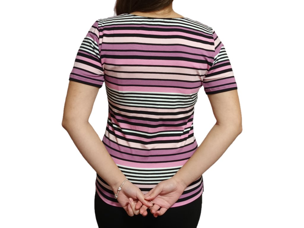 Letní halenka od firmy Sabatti s krátkým rukávem. Látka je růžová s černým a fialovým proužkem.