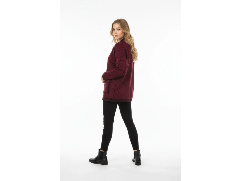 Kabát od firmy Ria móda na knoflíky s kapsami. Látka vínová s černým vzorem.
