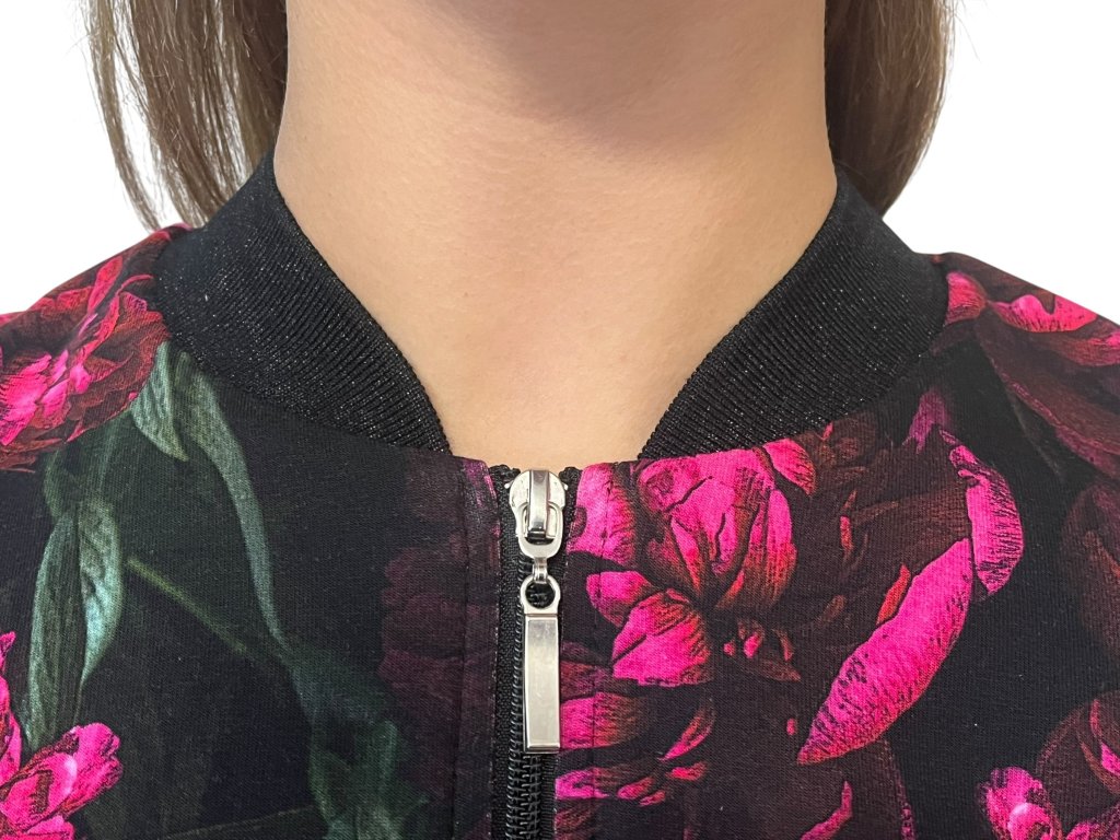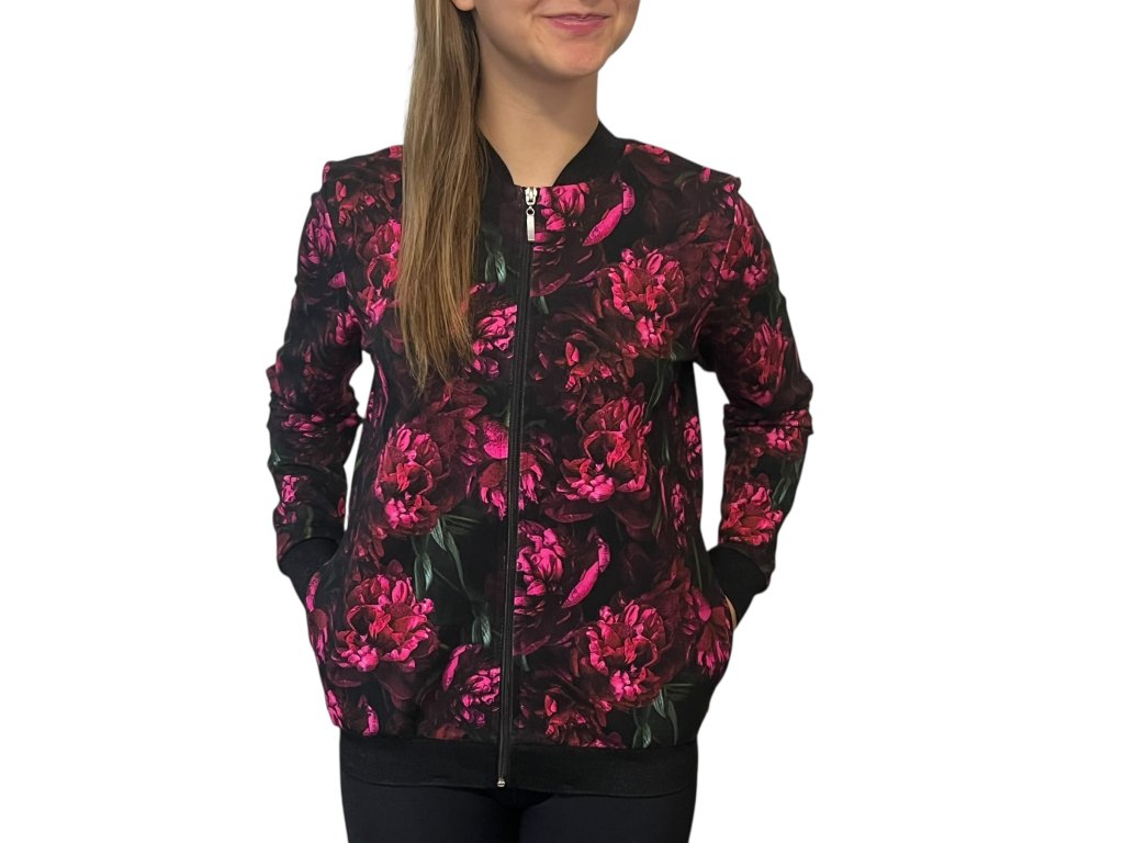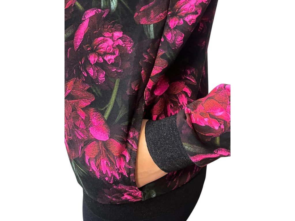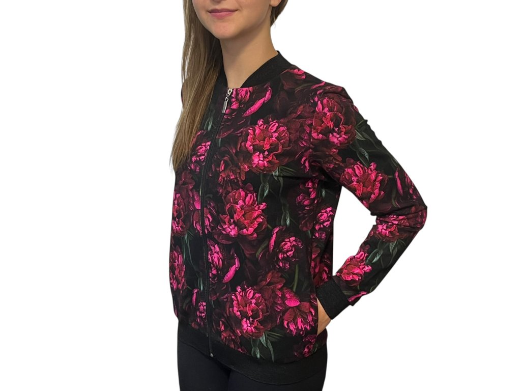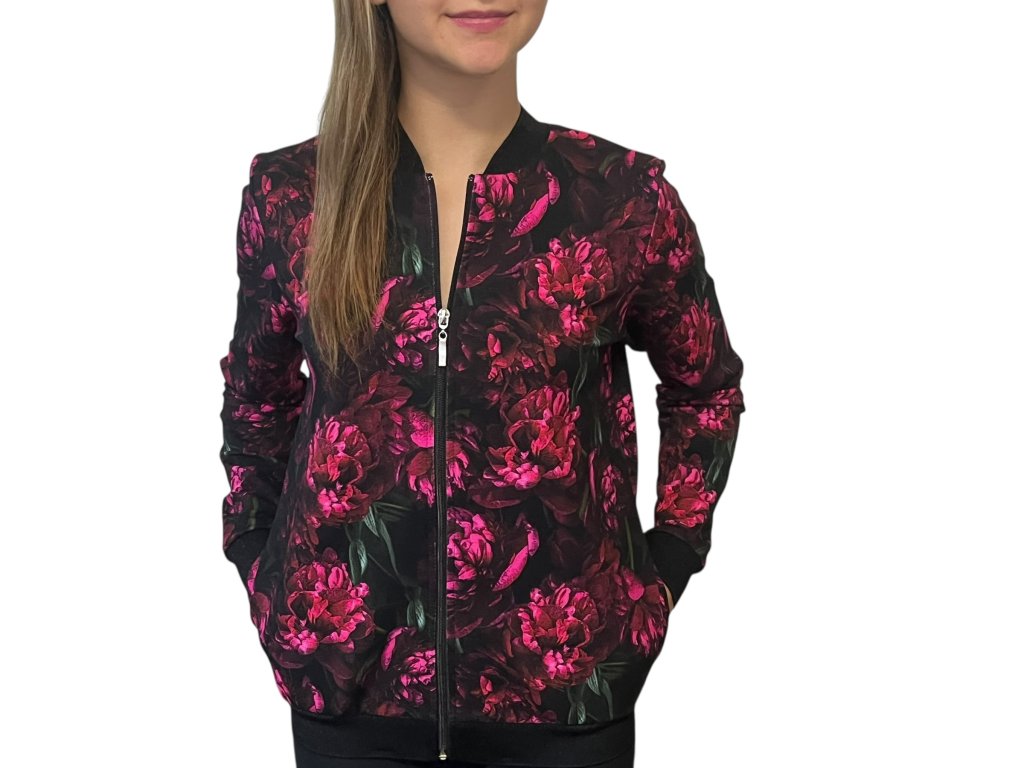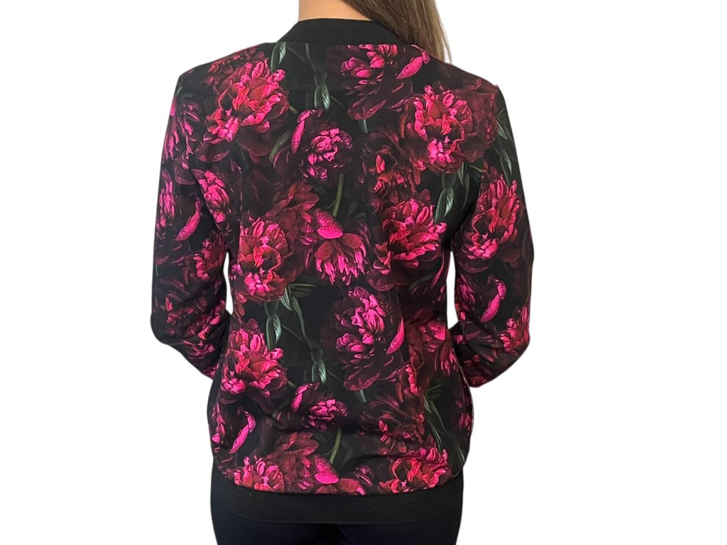 Bundička od firmy Sabatti s dlouhým rukávem, malým stojáčkem a kapsami. Látka je černá s červenými květy. Bunda má zip který lze rozepnout po celé délce. Bundička má ramenní vycpávky, které lze odpárat.