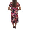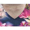 Letní šaty od firmy Ina s krátkým rukávem. Látka je tmavě modrá s růžovými tulipány. Dekolt je to véčka. Střih šatů "šipka" prostřiženo v pase.
