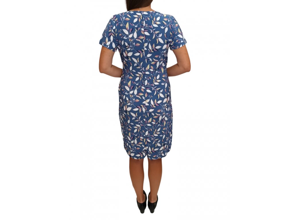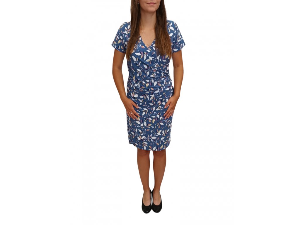 Krásné letní šaty od firmy Pratto s krátkým rukávem. Látka je modrá s drobnými lístky. Dekolt je překřížený a lehce nařasen na stranu.