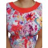 Nový střih šatů od firmy Sabatti se spadeným rukávem. Látka je bílá s barevnými kvítky. Tento střih má řasení přes prsa.