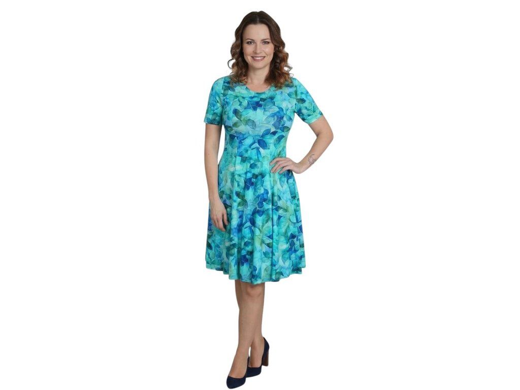 Krásné šaty od firmy Sofistik s krátkým rukávem. Látka je modro-zelená.