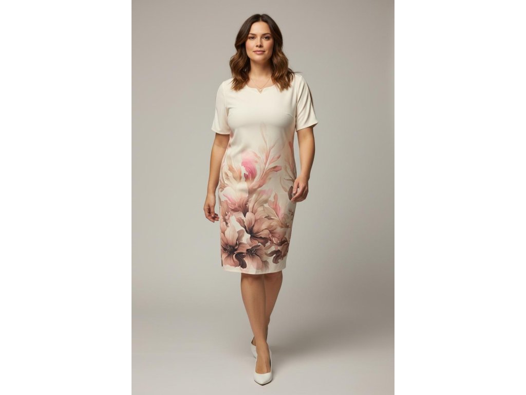 Elegantní šaty od firmy Agiss s krátkým prostřiženým rukávem. Látka je béžová s růžovými květy. Šaty mají zip na zádech. K šatům lze zakoupit i sako, které vypadá a sedí skvěle. Kód saka: 12001