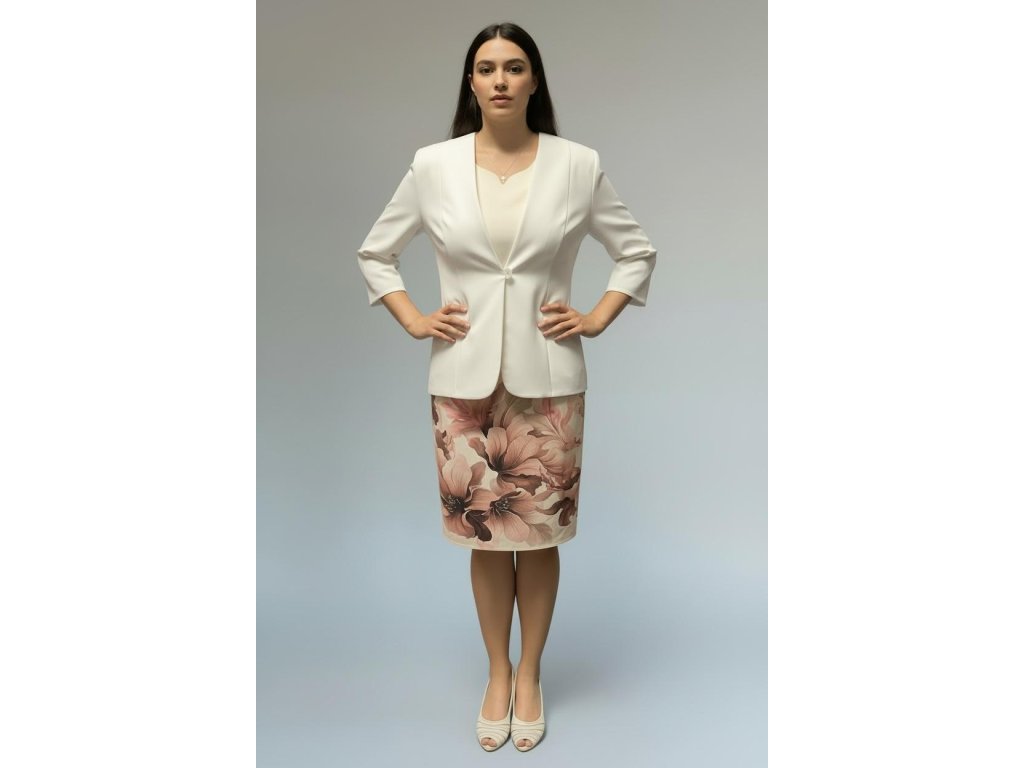 Elegantní šaty od firmy Agiss s krátkým prostřiženým rukávem. Látka je béžová s růžovými květy. Šaty mají zip na zádech. K šatům lze zakoupit i sako, které vypadá a sedí skvěle.