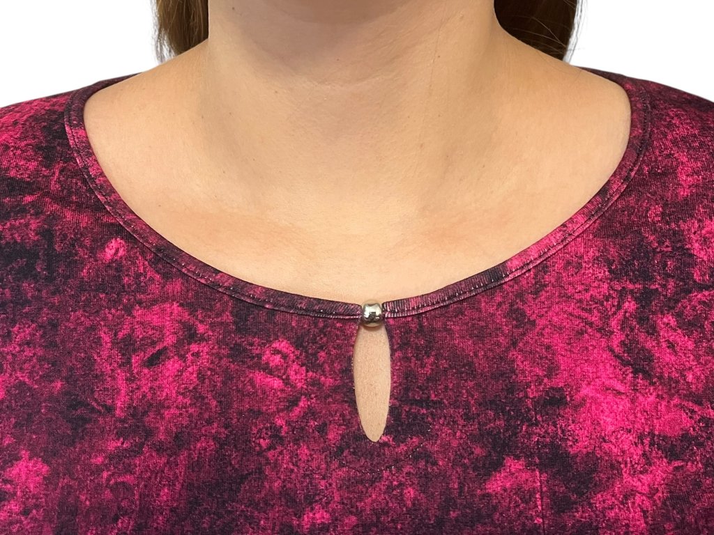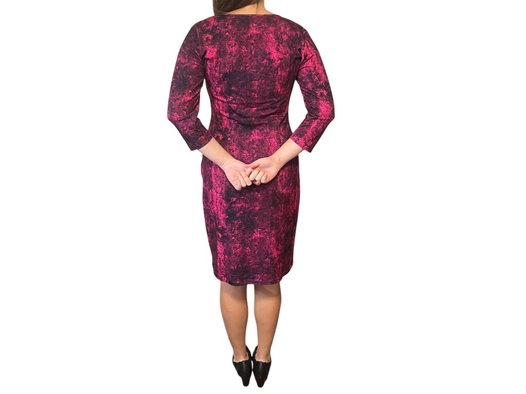 Šaty od firmy Sabatti s 3/4 rukávem v pouzdrovém střihu. Látka je černo-růžová. Dekolt je doplněn stříbrnou sponou.