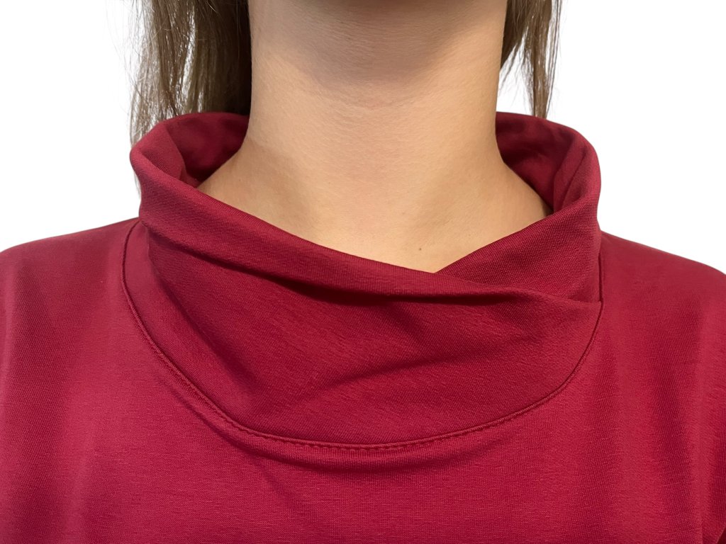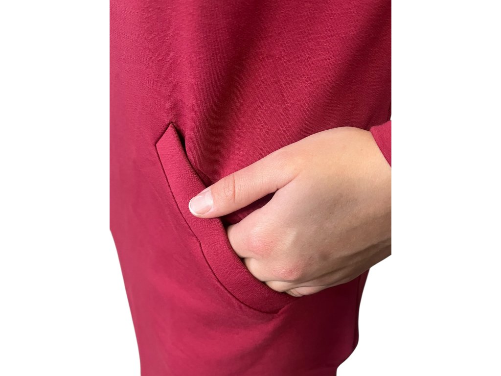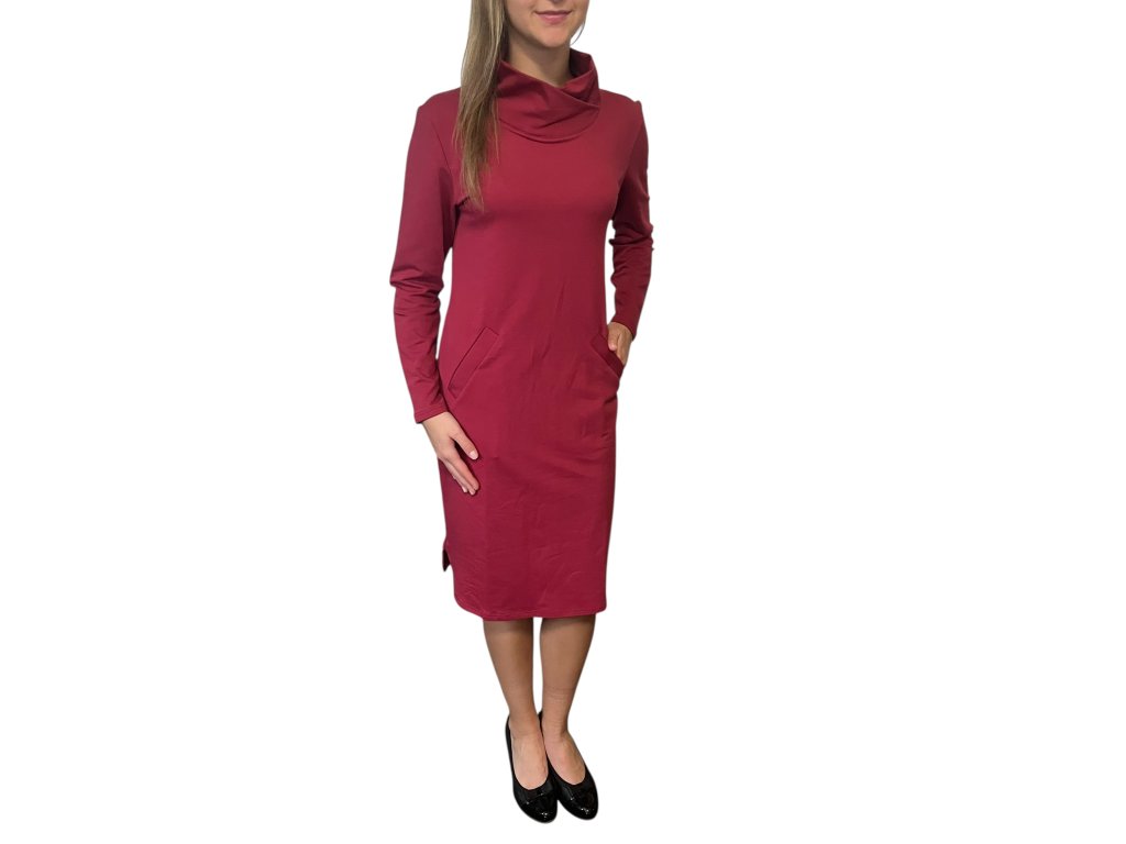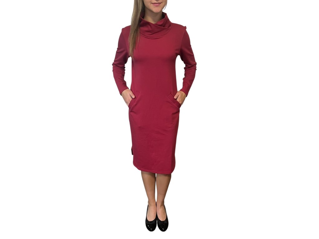 Šaty od firmy Sofistik s dlouhým rukávem a kapsami. Látka je tmavě červená. Šaty jsou se šálovým límcem, který lze upravit dle potřeby.