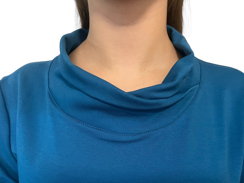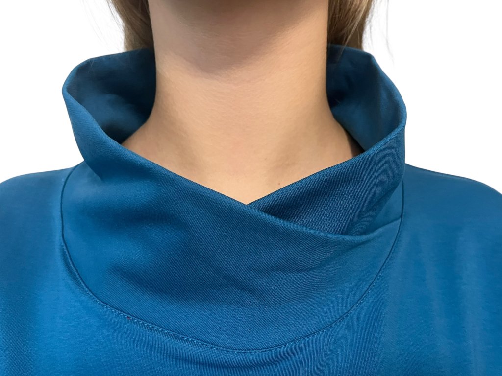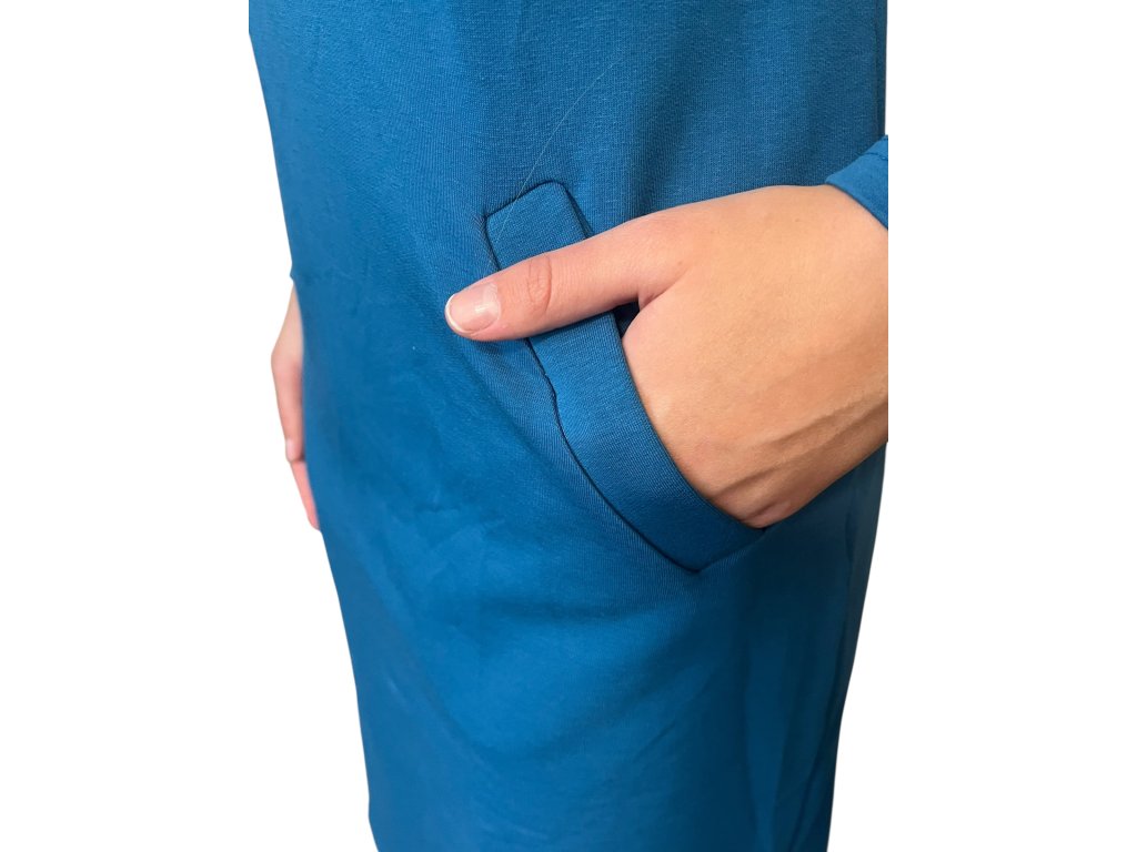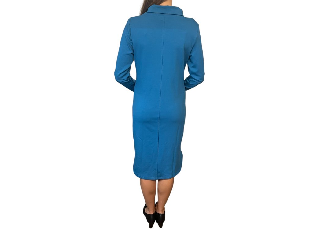 Šaty od firmy Sofistik s dlouhým rukávem a kapsami. Látka je tyrkysová. Šaty jsou se šálovým límcem, který lze upravit dle potřeby.