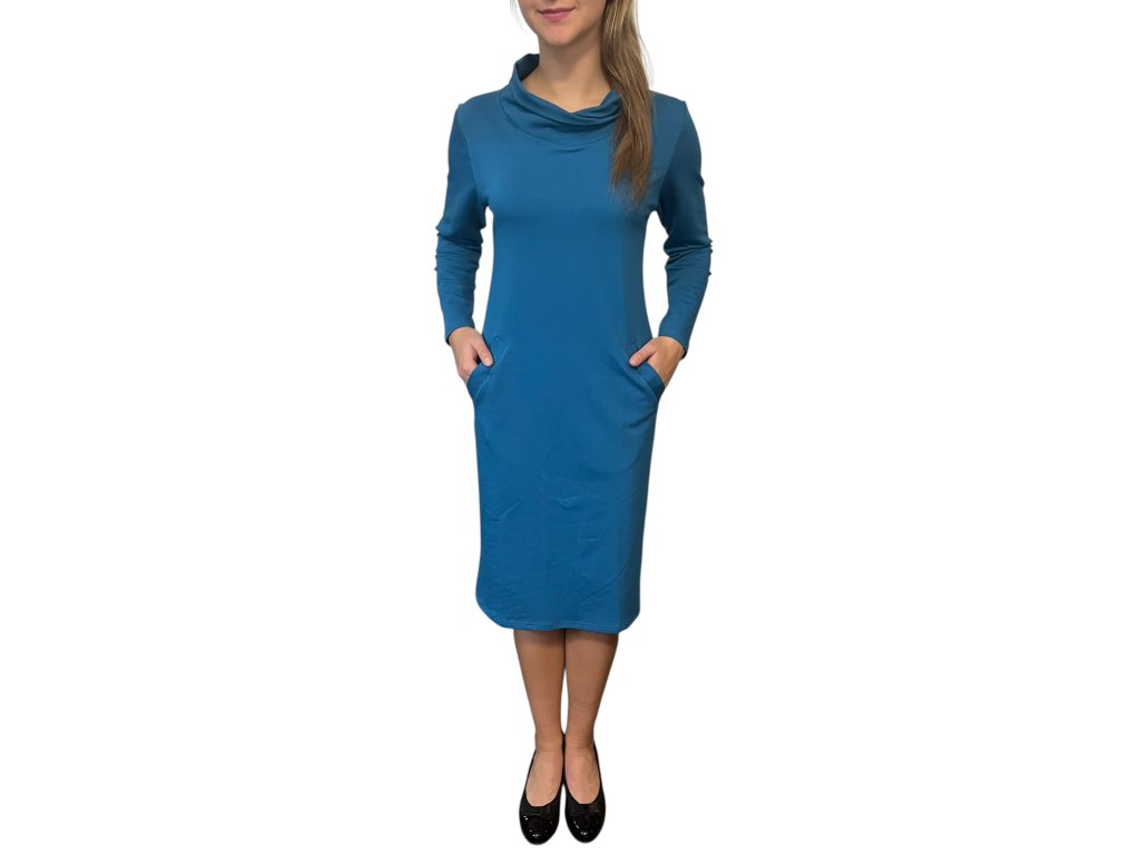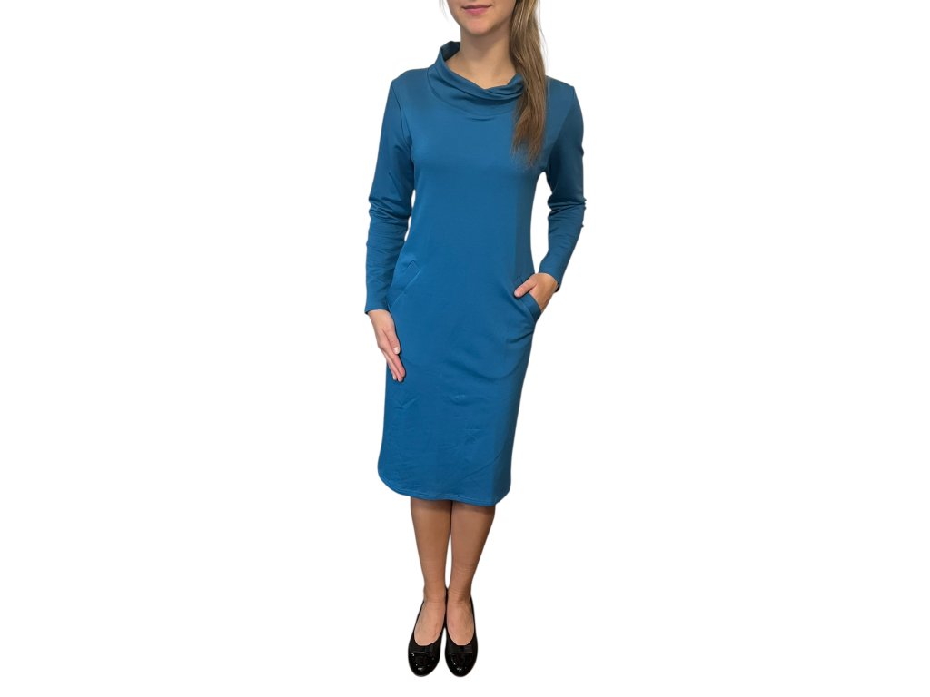 Šaty od firmy Sofistik s dlouhým rukávem a kapsami. Látka je tyrkysová. Šaty jsou se šálovým límcem.