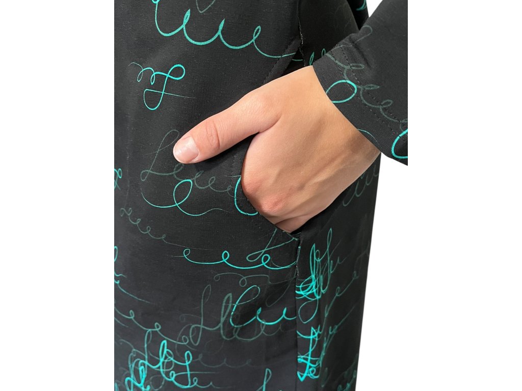 Šaty od firmy Sofistik s dlouhým rukávem s kapsami. Látka je černá se zelenými vzory.
