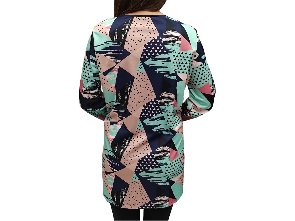Tunika od firmy Ina s dlouhým rukávem. Látka je zelená, tmavě modrá s béžovým vzorem. Tunika je doplněná nákrčníkem, kterým můžete obohatit svůj outfit.