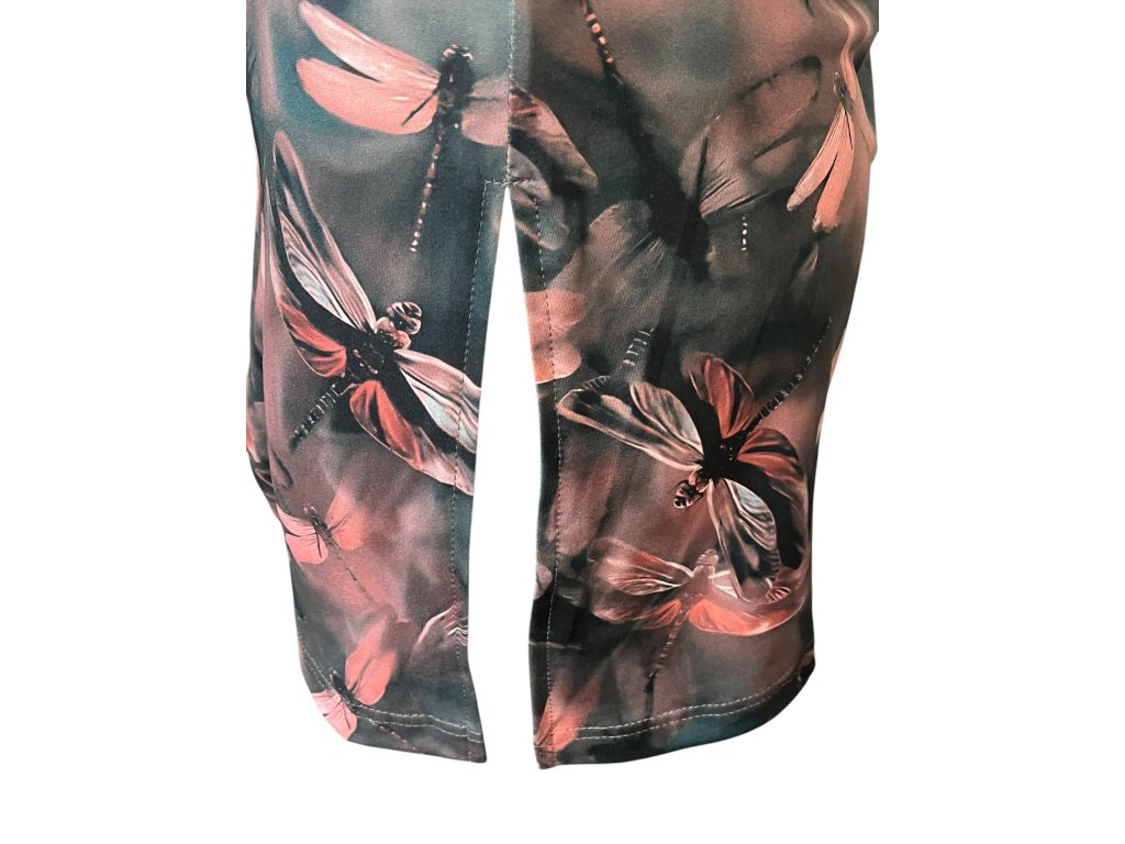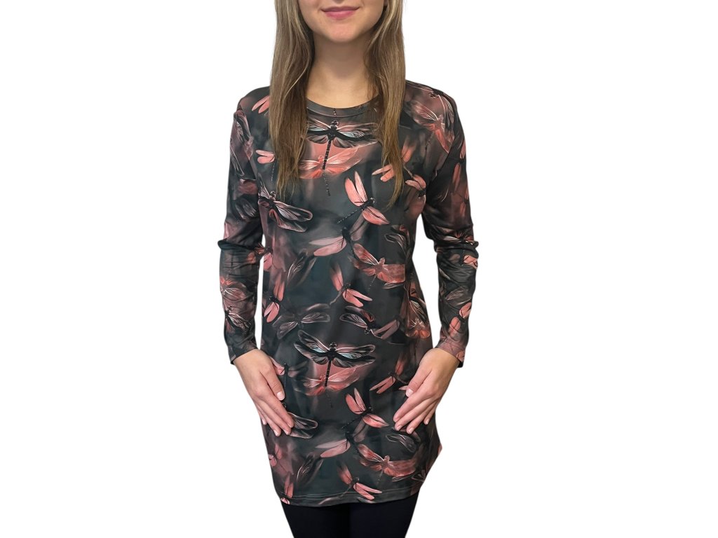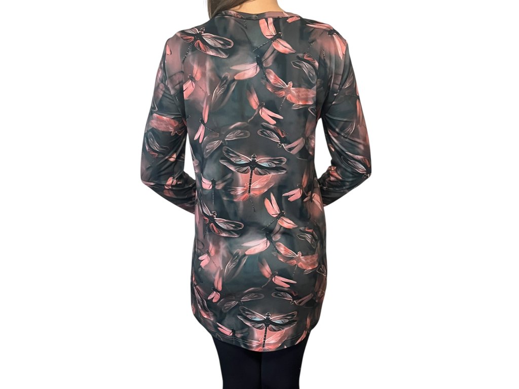 Elegantní tunika od firmy Kepa style s dlouhým rukávem. Látka je šedá s oranžovými vážkami. Na bocích jsou rozparky. Ideální k legínám.