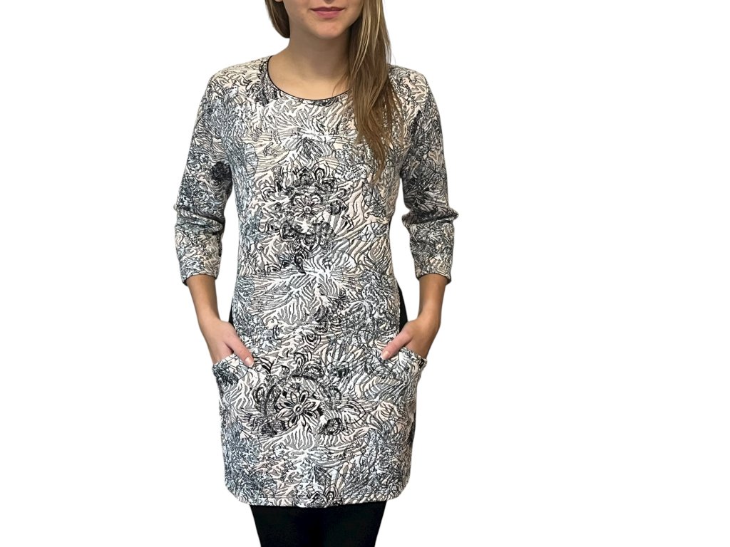 Teplejší tunika od firmy Sabatti s 3/4 rukávem. Látka je béžová s šedým vzorem (květy) . Kapsy jsou černé.